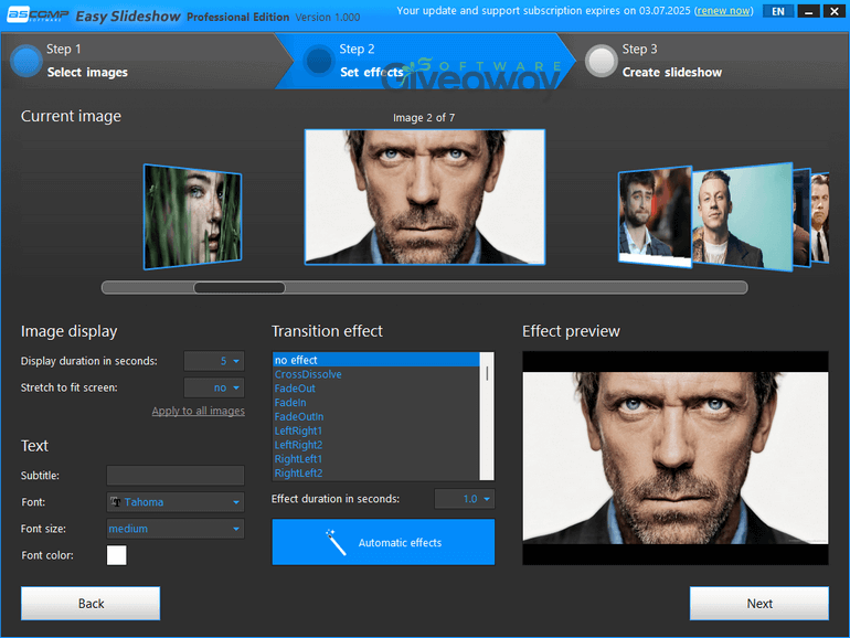 Easy Slideshow Professional v2.000 نرمافزاری ساده و قدرتمند برای ساخت اسلایدشوهای تصویری با موسیقی، افکتهای متنوع و خروجی با کیفیت بالا است. مناسب برای کاربران خانگی، تولید محتوا، و ارائههای حرفهای.